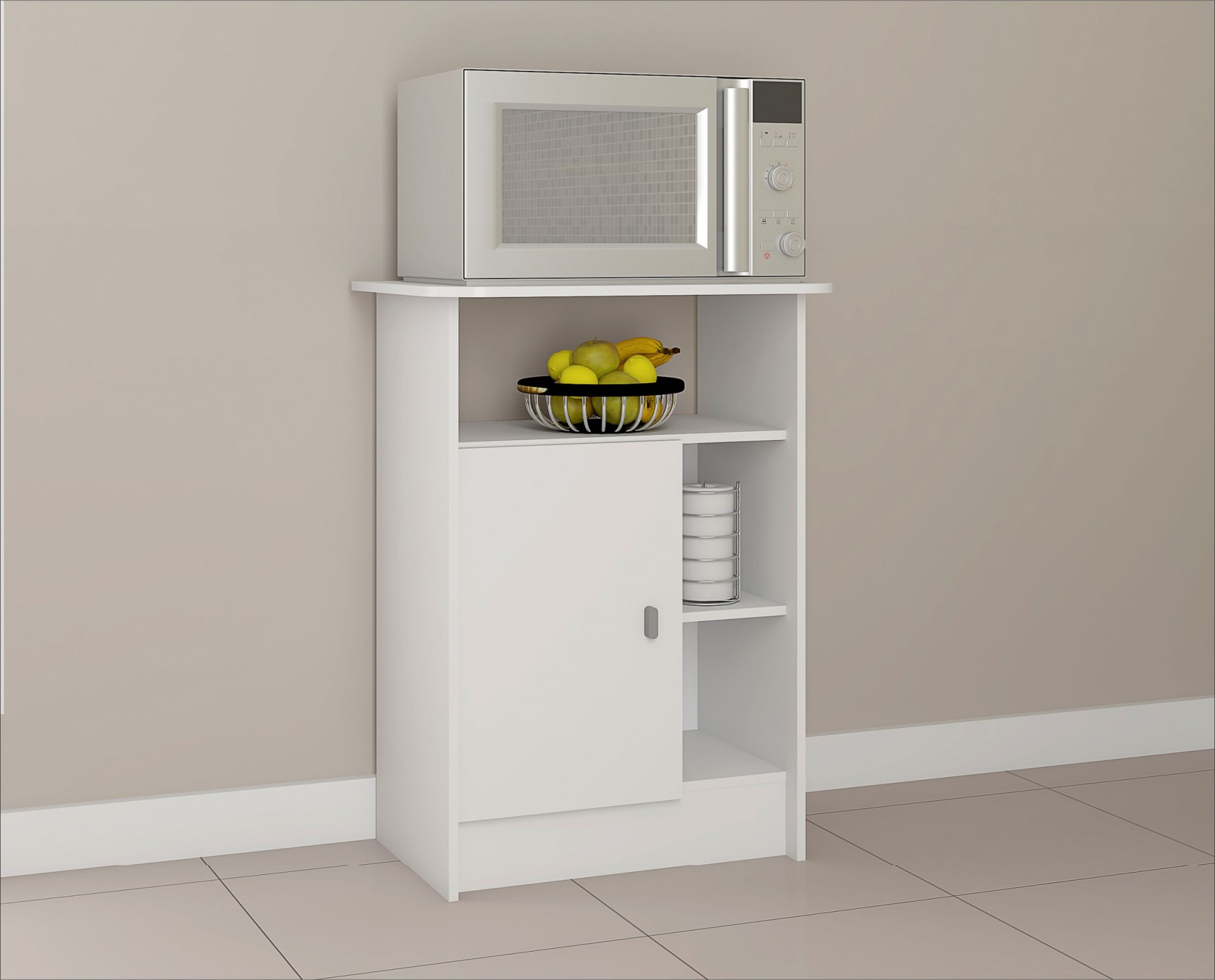 O Armário Multiuso Gramado é ideal para organizar seu espaço com praticidade de rapidez. Pode ser usado para apoiar seu forno de microondas, fruteira, usar apenas como armário ou como você preferir. Possui porta com prateleiras, tampo em MDF e nicho para organização.