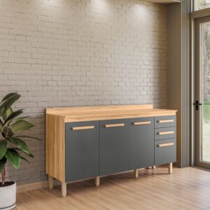 O Balcão de 1,57cm para pia de 160cm. Reúne características decorativas, delicadas e práticas em seu design, possibilitando a montagem em diversos ambientes. O espaço interno, que vem com prateleiras e divisória, é ótimo para organização dos utensílios e mantimentos.