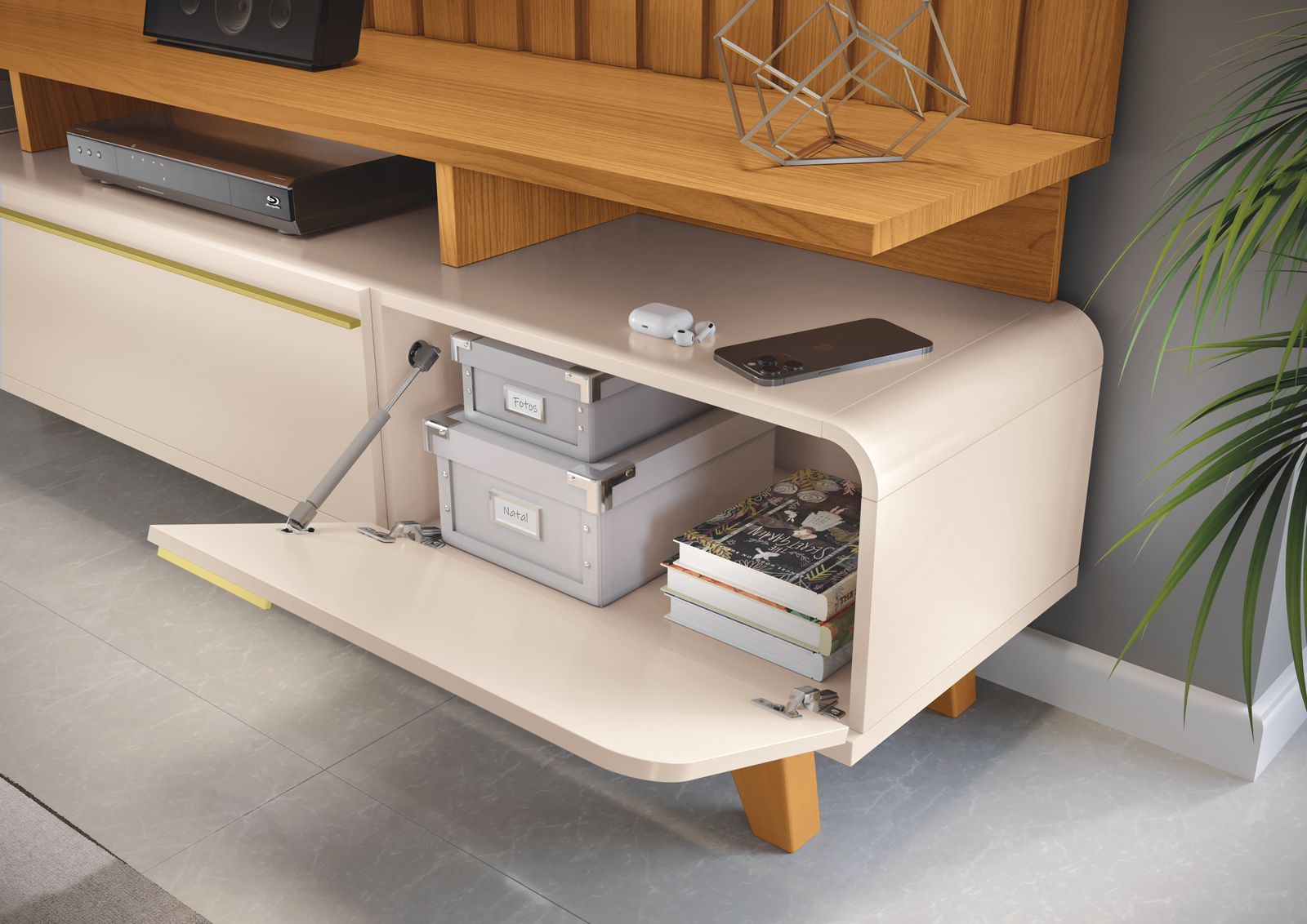 A Bancada Essenza é uma mescla de modernidade e sofisticação, unindo elementos orgânicos e cantos arredondados para criar um estilo singular. O Rack Bancada com sua estrutura oferece um suporte sólido e elegante. Com três portas basculantes equipadas com pistão a gás, o acesso aos compartimentos é suave e prático. Os puxadores metálicos em tom dourado acrescentam um toque de requinte ao móvel. Sustentado por pés de madeira maciça com acabamento envernizado, o Rack Bancada Essenza não só atrai visualmente, mas também é durável e resistente.