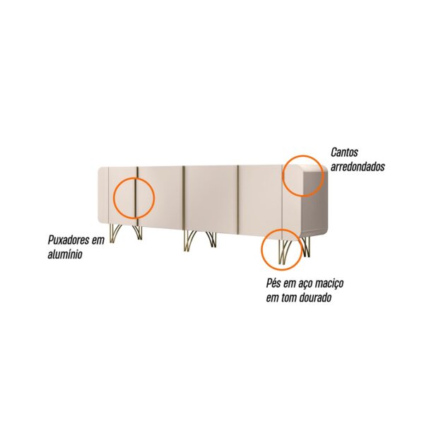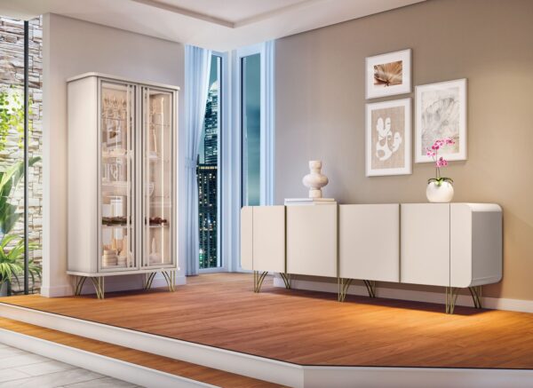 O Balcão Buffet Saluti exibe uma elegância atemporal com seus cantos arredondados e generoso espaço interno, transformando qualquer ambiente em um cenário de refinamento. Suas quatro portas, articuladas lateralmente, são adornadas por puxadores em alumínio com delicado acabamento dourado, adicionando um toque de sofisticação. A experiência de utilização é aprimorada pelo sistema de amortecimento nas portas, garantindo um fechamento suave e silencioso, como um sussurro de elegância. Apoiado sobre pés em aço maciço 3/8, com um sutil toque dourado, o Buffet não apenas encanta visualmente, mas também se destaca pela durabilidade. Produzido com a excelência do MDF e MDP de 15mm, este móvel é mais do que uma peça funcional, é uma expressão de requinte. O Buffet Saluti transcende a utilidade prática e torna-se uma obra de arte, elevando o ambiente a um patamar de beleza e harmonia.