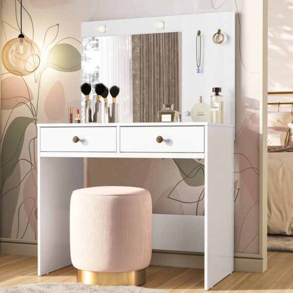 Descubra a Penteadeira Moval Ideal 2 Gavetas com Espelho. Eleve sua rotina de beleza a um novo patamar! Esta penteadeira foi cuidadosamente projetada para atender às suas necessidades de organização e praticidade.