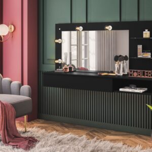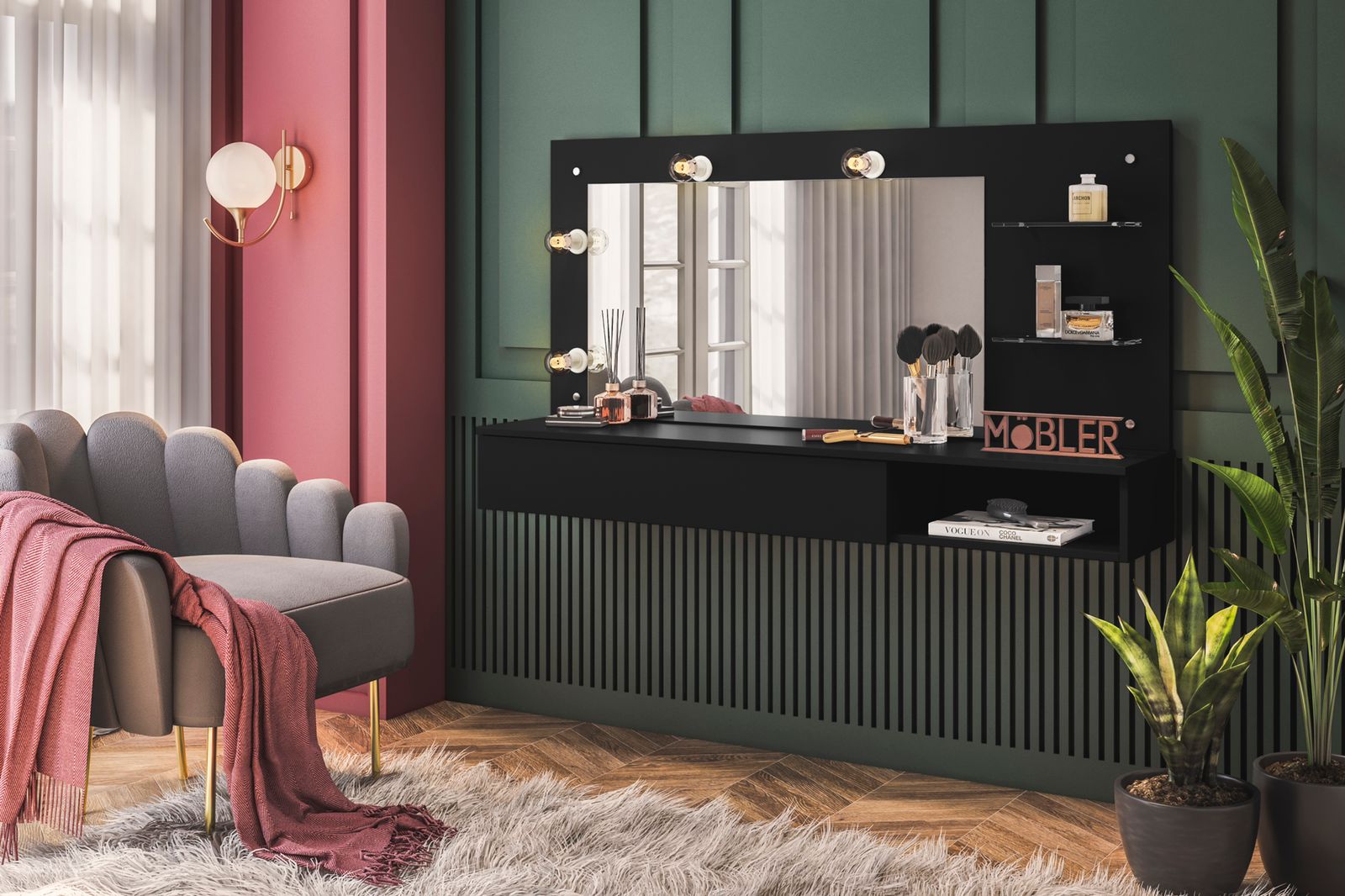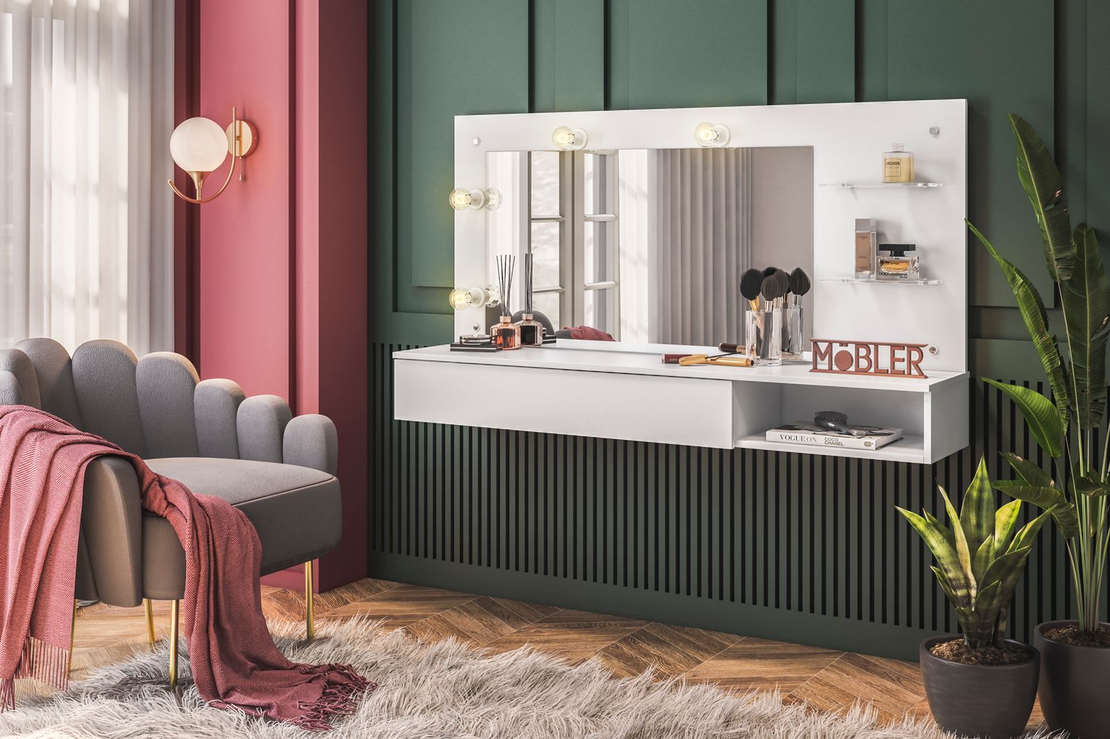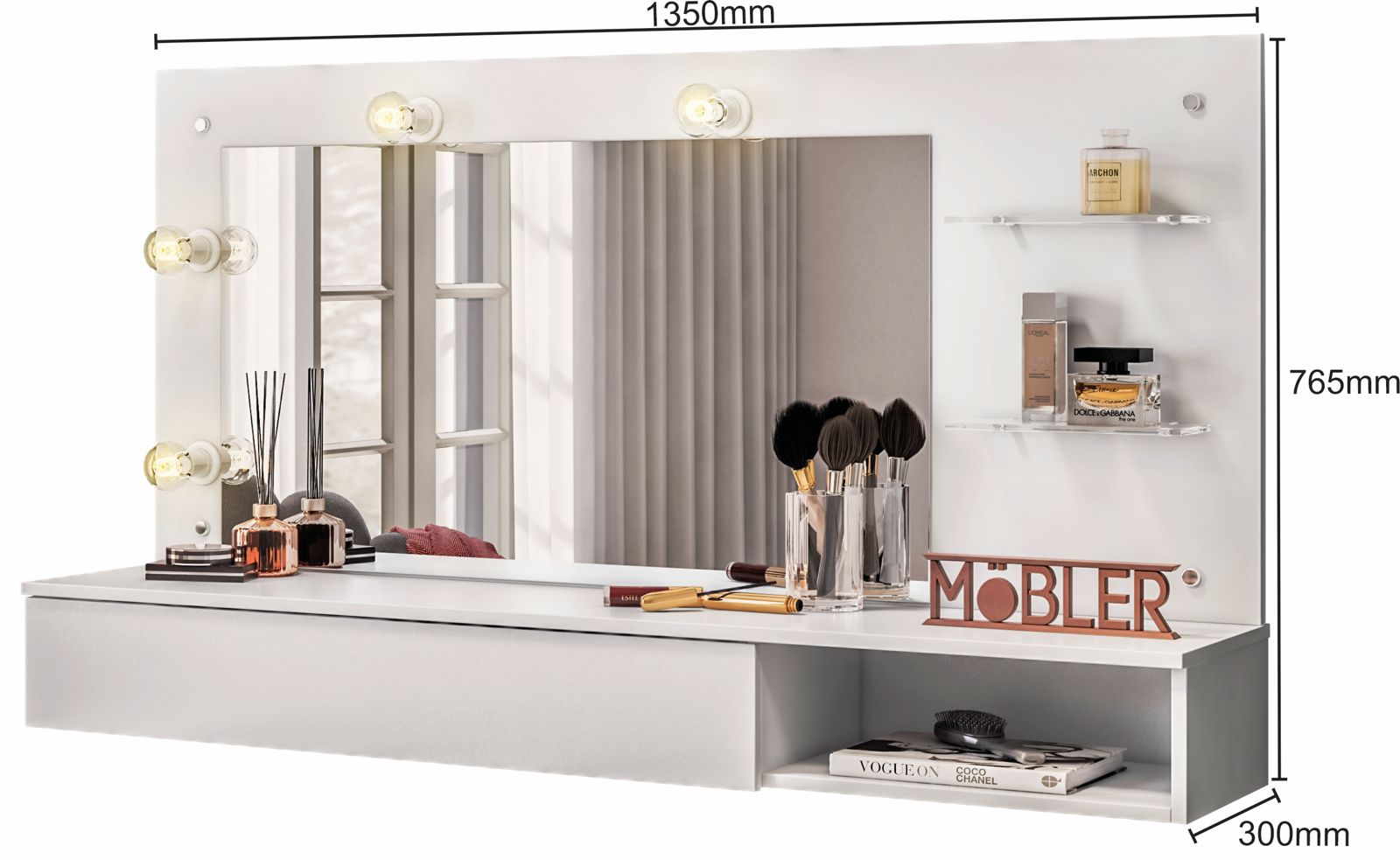 Tenha seu próprio Camarim particular, organize seus objetos, decore seu espaço. Camarim Lumiere te proporciona um ambiente perfeito para colocar a Make em dia e dar aquela ajeitada no look. Característica do Produto Estrutura: MDP 15 mm- 02 Prateleiras de vidro 6 mm.