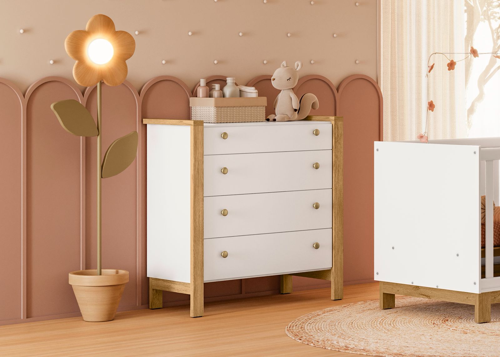 A Linha Flora foi criada para compor quartos infantis acolhedores, combinando funcionalidade e delicadeza, valorizando cada detalhe do ambiente. A Cômoda 4 Gavetas Flora, compõe o ambiente de forma prática e funcional, com suas 4 gavetas, oferece organização eficiente para roupas e itens do dia a dia. Os detalhes em MDF e puxadores metalizados, adicionam um toque natural e elegante ao design atemporal da linha.
