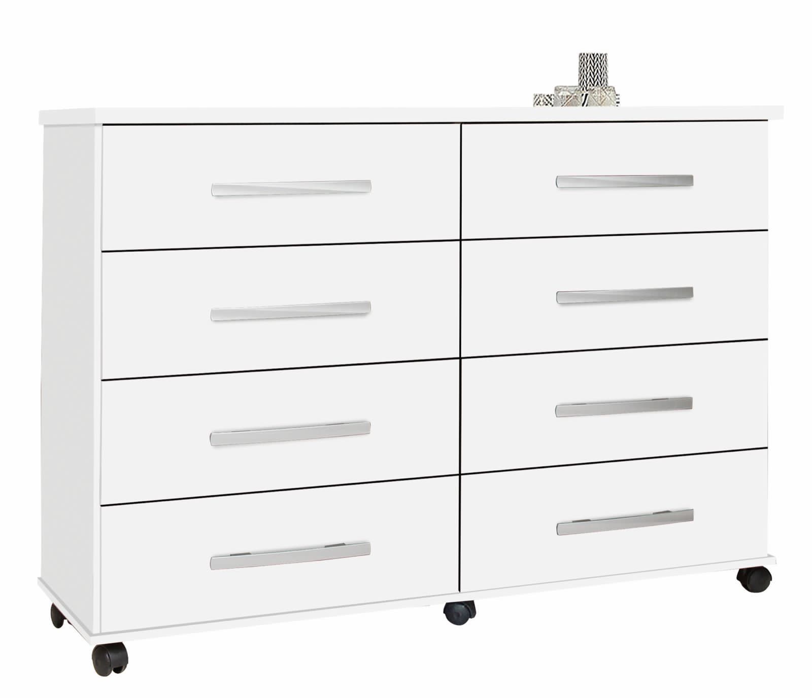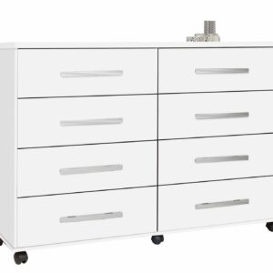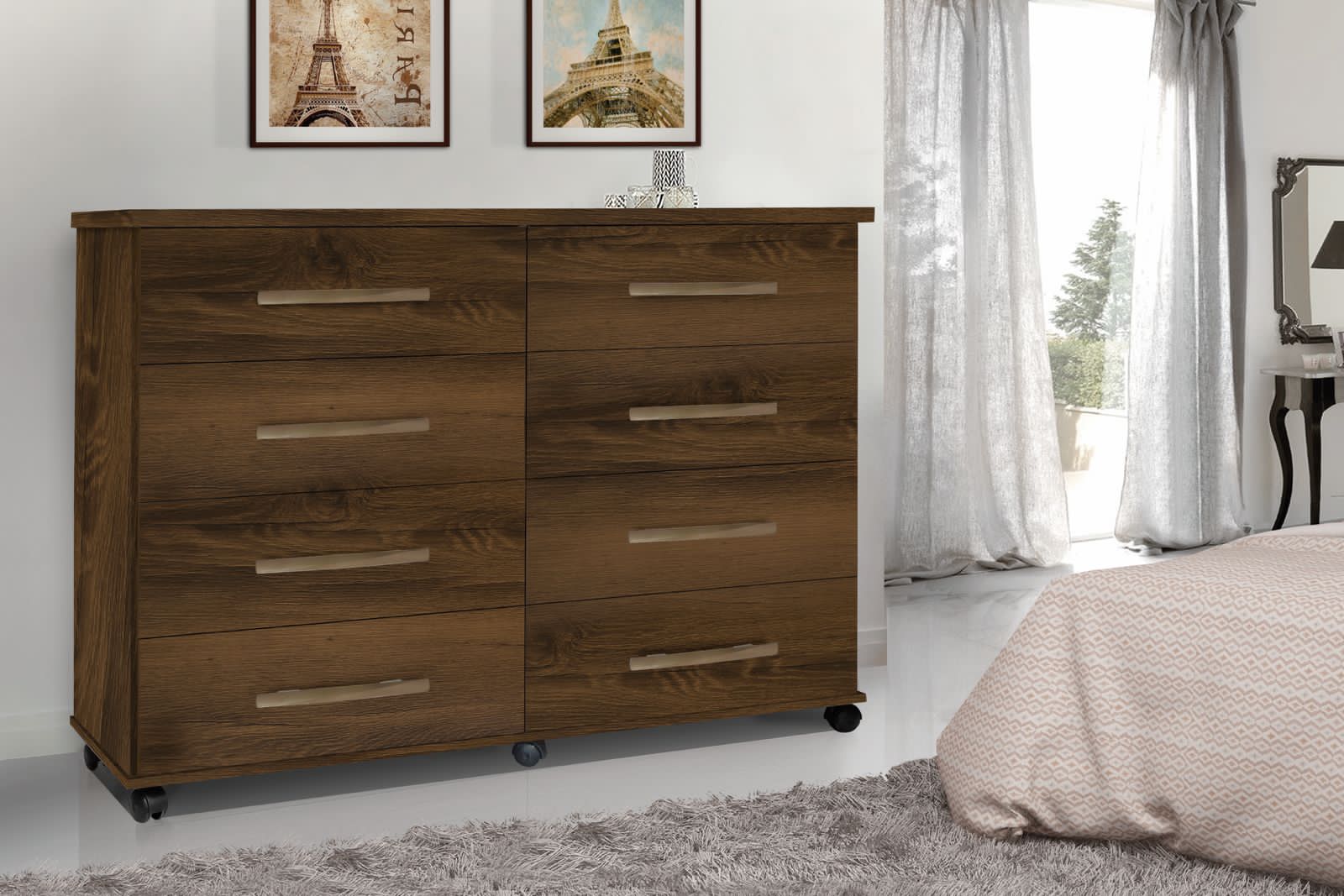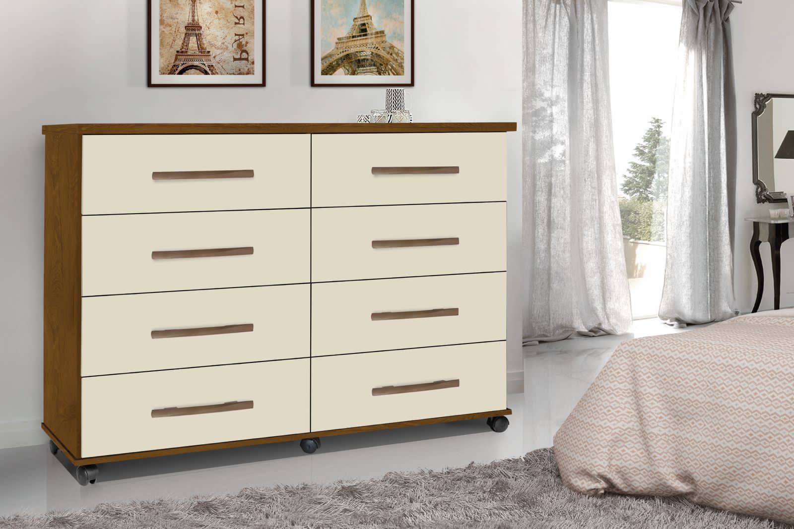 A cômoda Jade é moderna e elegante, possui 8 gavetas que proporcionam maior amplitude para organizar peças e objetos pessoais. Acabamento interno na mesma cor do móvel, com corrediças telescópicas e rodízios para melhor manejo do produto na hora da limpeza, possui travas nas partes inferiores das gavetas, puxadores externos.