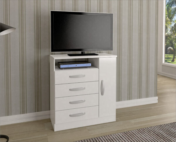 Uma cômoda com bastante espaço e funcionalidades é essencial para uma boa organização. A cômoda Delta tem espaço de sobra, pois tem 5 gavetas grandes e uma sapateira com prateleiras. Além disso, você pode usá-la para colocar sua TV e/ou sistema de vídeo e som.