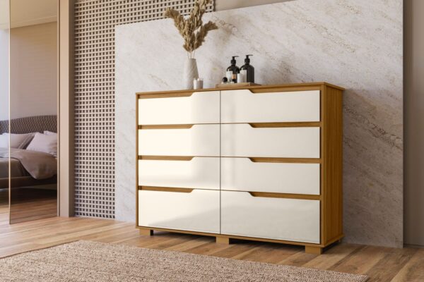 A Cômoda Georgia é um móvel espaçoso e funcional, oferecendo ampla capacidade de armazenamento. Possui um total de oito gavetas, As corrediças telescópicas permitem um deslizamento suave e fácil das gavetas, proporcionando acesso conveniente e organização eficiente do conteúdo armazenado. Esta configuração é ideal para quem precisa de uma solução de armazenamento versátil e diversificada, permitindo a organização de uma variedade de itens, desde roupas a acessórios, de maneira prática e acessível.