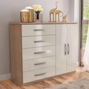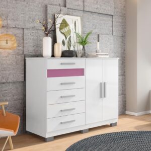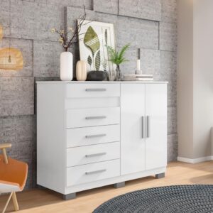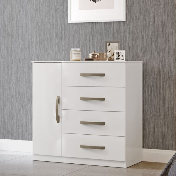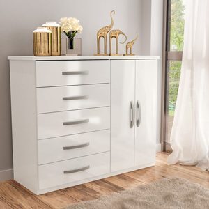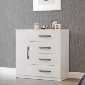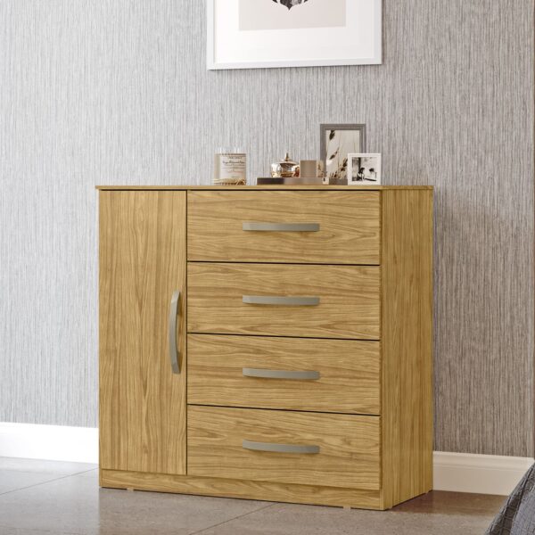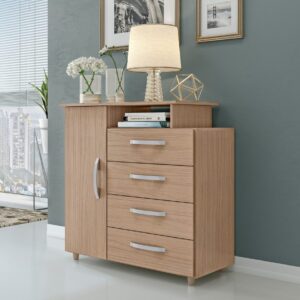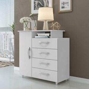 Cômoda Pilar possui uma porta de abrir e quatro gavetas é uma opção que une o melhor do espaço interno com simplicidade, charme e praticidade.