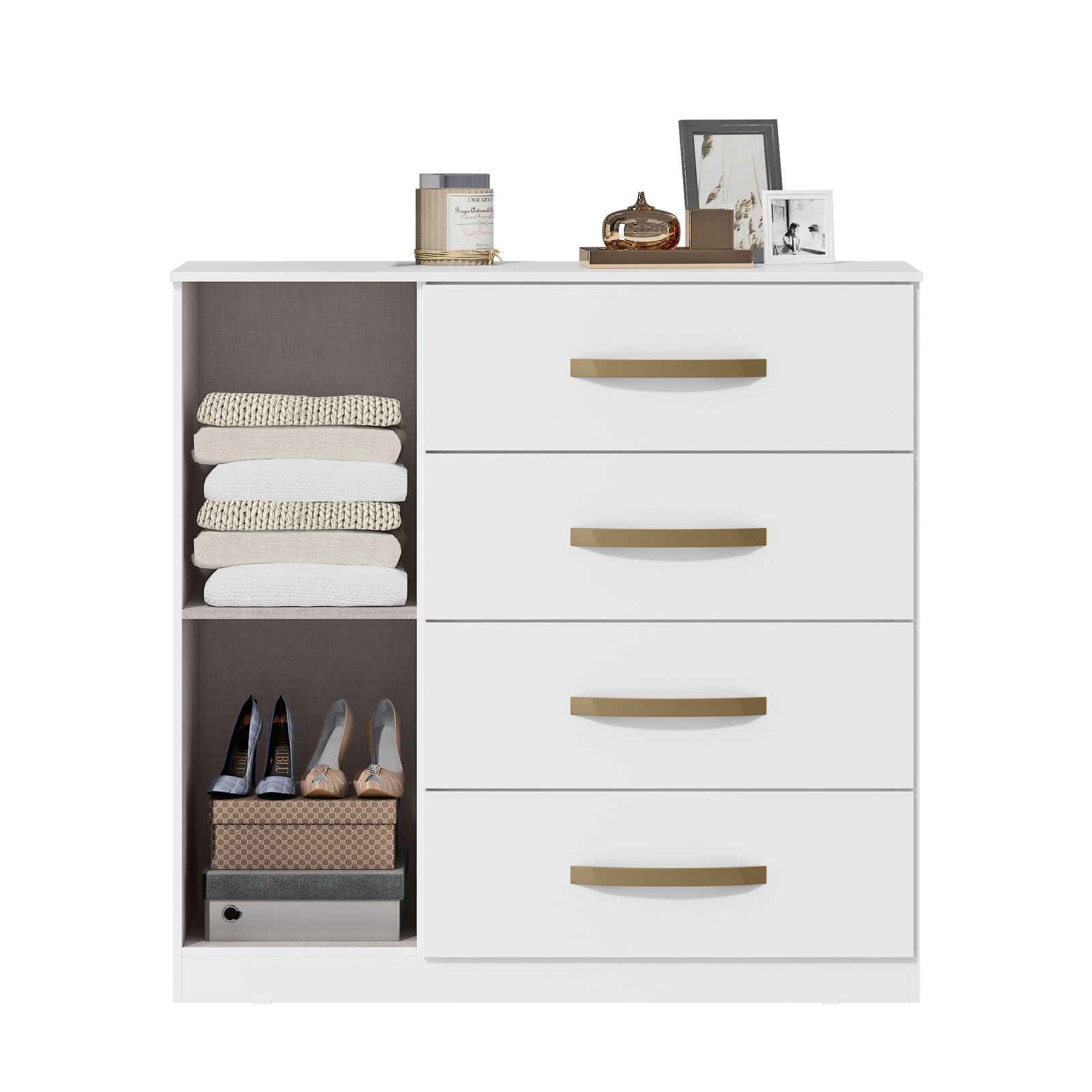 O tamanho é pensado especialmente para a necessidade de um casal ou de uma pessoa solteira. A divisão interna é ótima, além de quatro gavetas espaçosas com corrediças Metálicas, mantendo a durabilidade e funcionalidade.