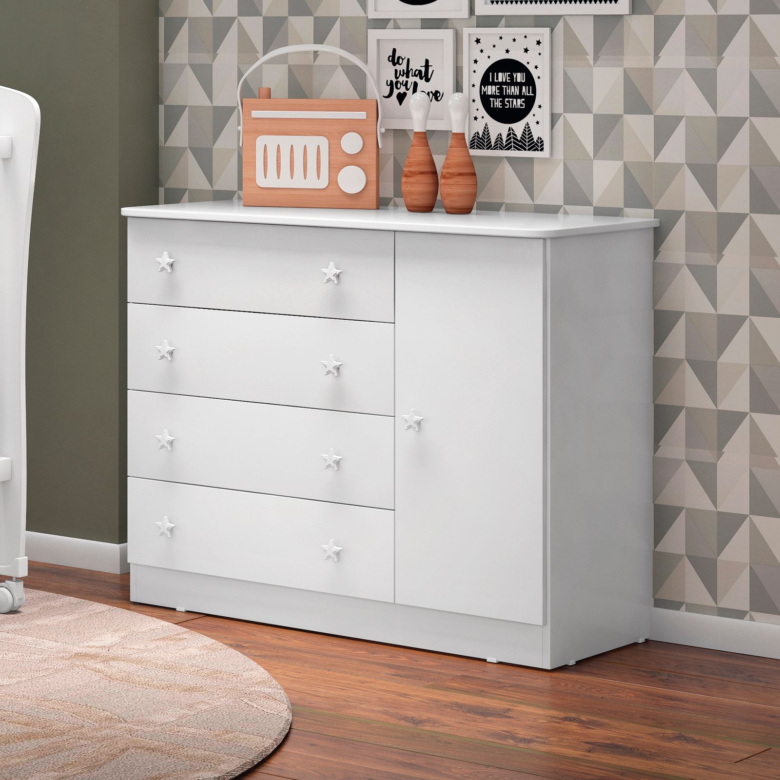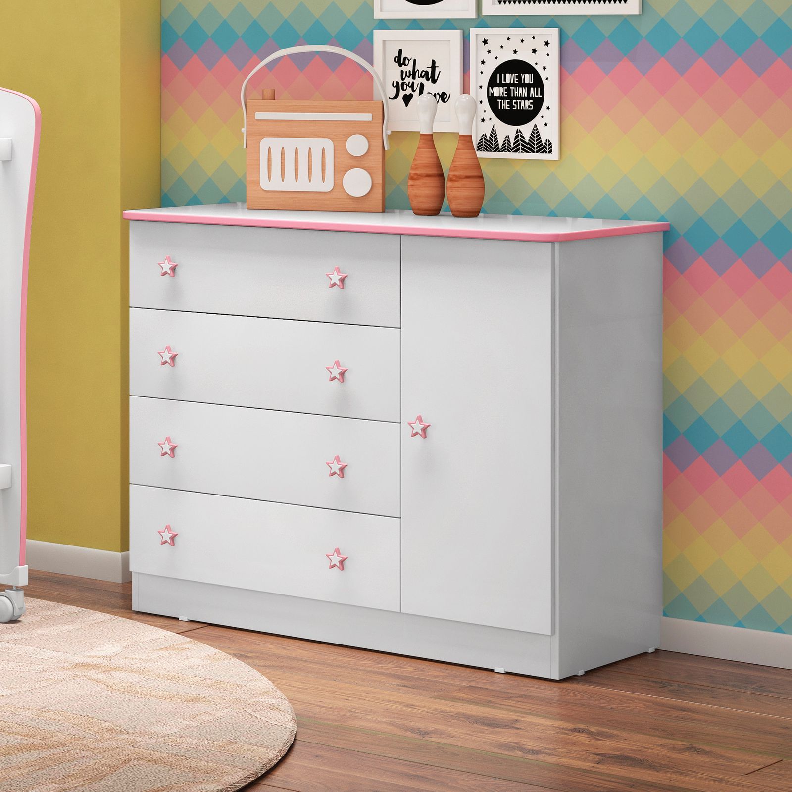 A Cômoda Sapateira Doce Sonho é a peça ideal para quem busca elegância e funcionalidade em um único produto. Com quatro gavetas com corrediças metálicas e uma porta com dobradiças metálicas. O móvel possui um excelente espaço interno para guardar roupas, sapatos e outros objetos.
