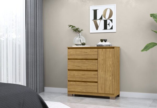 A Cômoda Vega possui uma porta de abrir e quatro gavetas é uma opção que une o melhor do espaço interno com simplicidade, charme e praticidade.