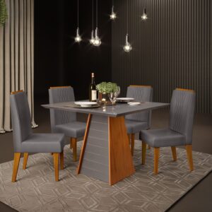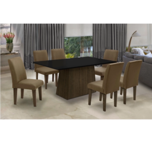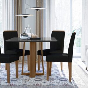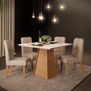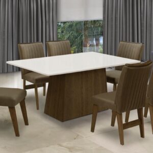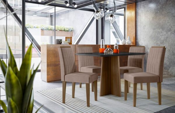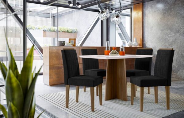 Nada mais gostoso do que um bom papo, uma boa comida, com ótimas companhias e uma decoração maravilhosa envolvendo tudo isso. Você pode aproveitar tudo isso através do design funcional e moderno do Conjunto de Mesa Ana e Cadeiras Ana. A mesa de Jantar é composta por tampo em MDF com vidro colado no tampo acabamento em pintura UV com pintura nas duas faces, garantindo maior qualidade e durabilidade para o móvel.