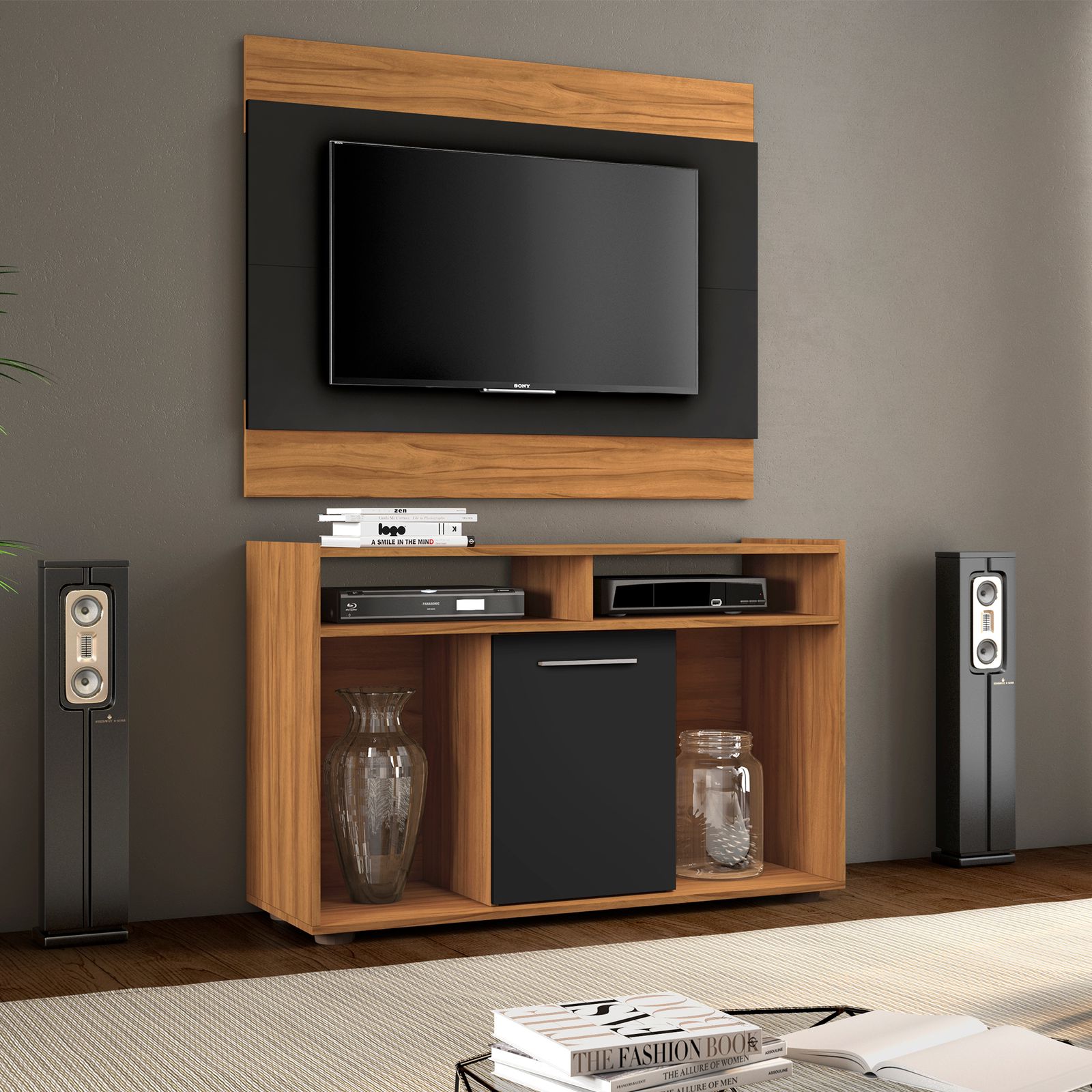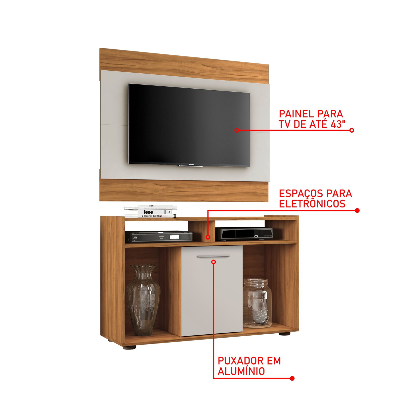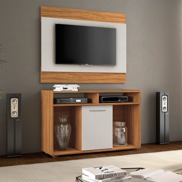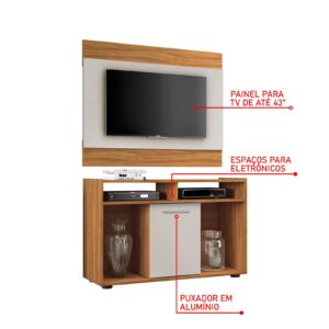Ele é composto por um painel suspenso fixado na parede e indicado especialmente para TVs até 43 polegadas, deixando a TV no lugar certo. O rack com espaços amplos, possibilitando por objetos decorativos, livros e eletroeletrônicos, além desses espaços possui também uma porta na parte central do rack.
