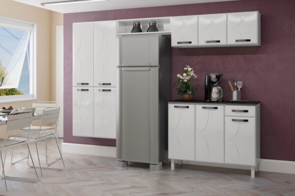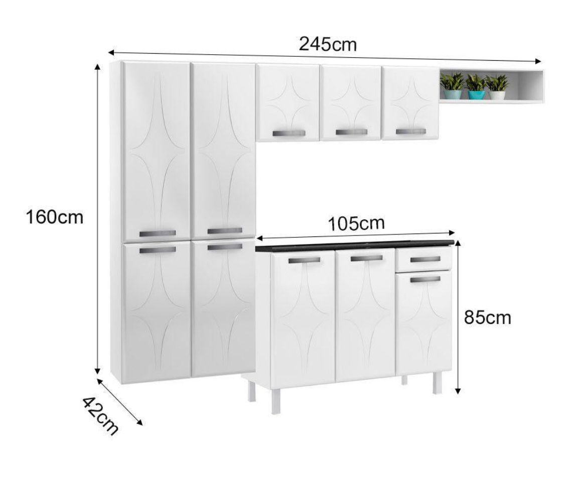 • Inclusos: 1 Paneleiro Quatro Portas, 1 Armário Triplo Baixo, 1 Nicho sem Vidro, 1 Balcão uma Gaveta