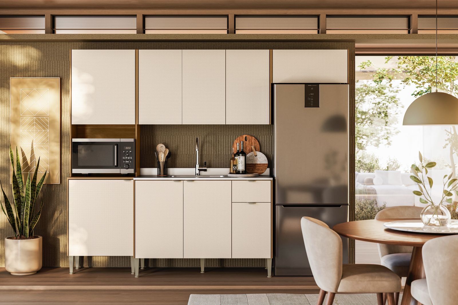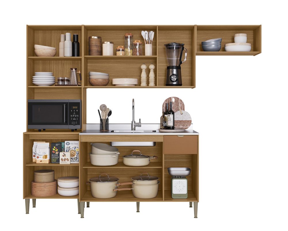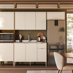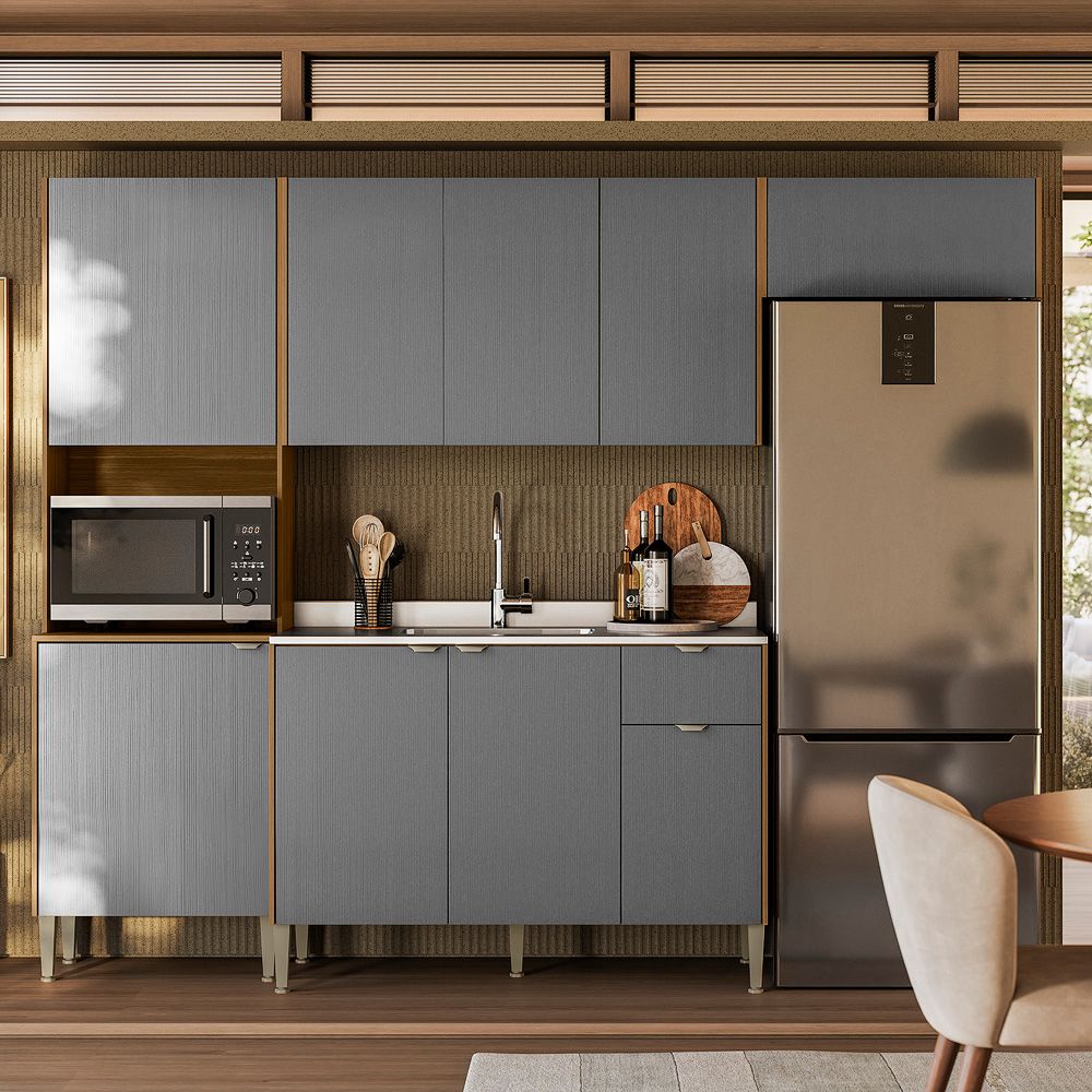 Cozinha Soul com design moderno e elegante, combinando tons e aconchego ao ambiente. Os armários oferecem praticidade e organização, enquanto os eletrodomésticos embutidos garantem um visual clean e sofisticado. Ideal para quem busca funcionalidade sem abrir mão de estilo.
