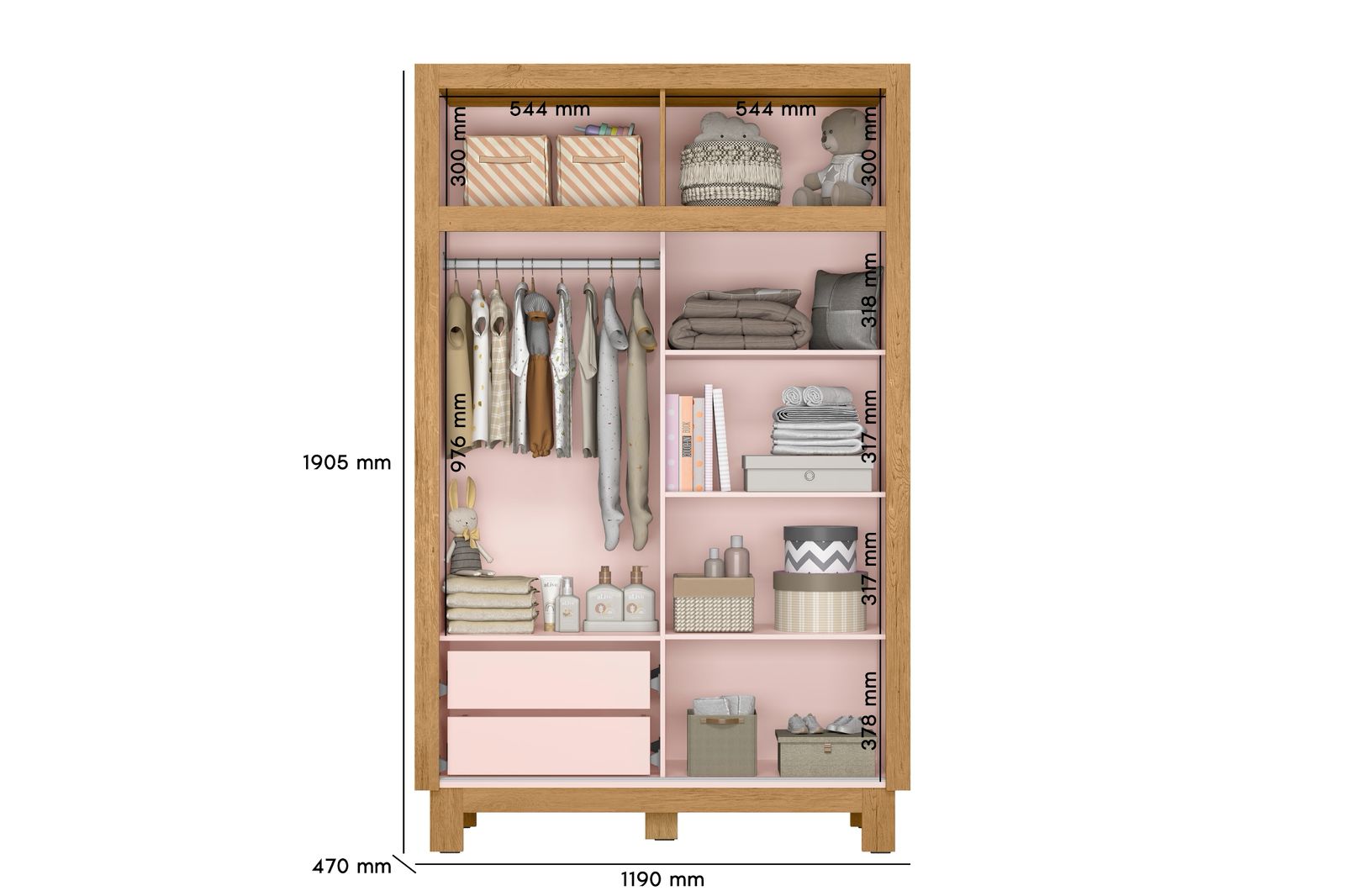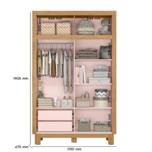 Roupa 2 Portas de Correr, traz praticidade e otimização do espaço no quarto do bebê, seu amplo espaço interno organiza com facilidade todo enxoval. Os detalhes em MDF e puxadores metalizados, adicionam um toque natural e elegante ao design atemporal da linha.
