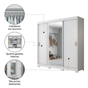Para quem está precisando de bastante espaço, o guarda-roupa 5020 é uma ótima escolha. Possui 3 portas deslizantes, cabideiros em alumínio, quatro gavetas internas com corrediças telescópicas e muito, mas muito espaço para você organizar seus pertences. E não podemos esquecer dos espelhos centrais, que dão um toque especial ao guarda-roupa e sempre vai lhe auxiliar na escolha do look