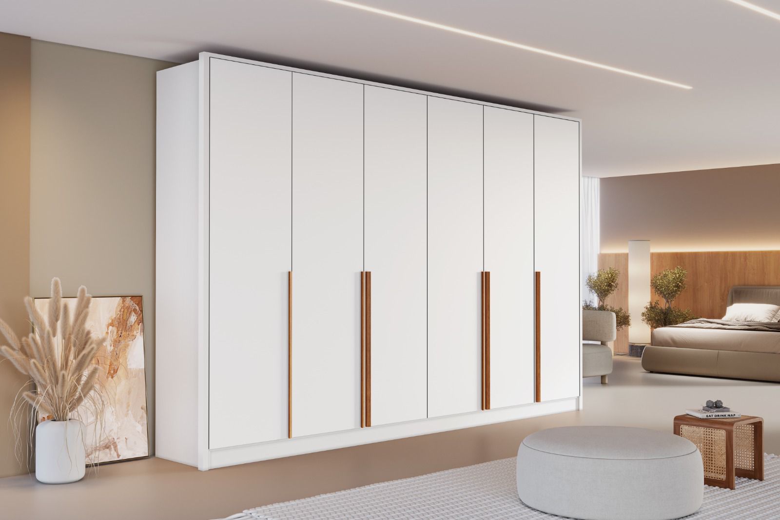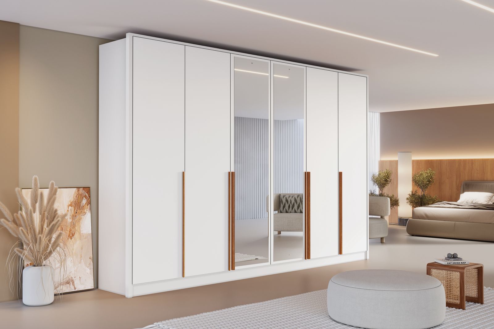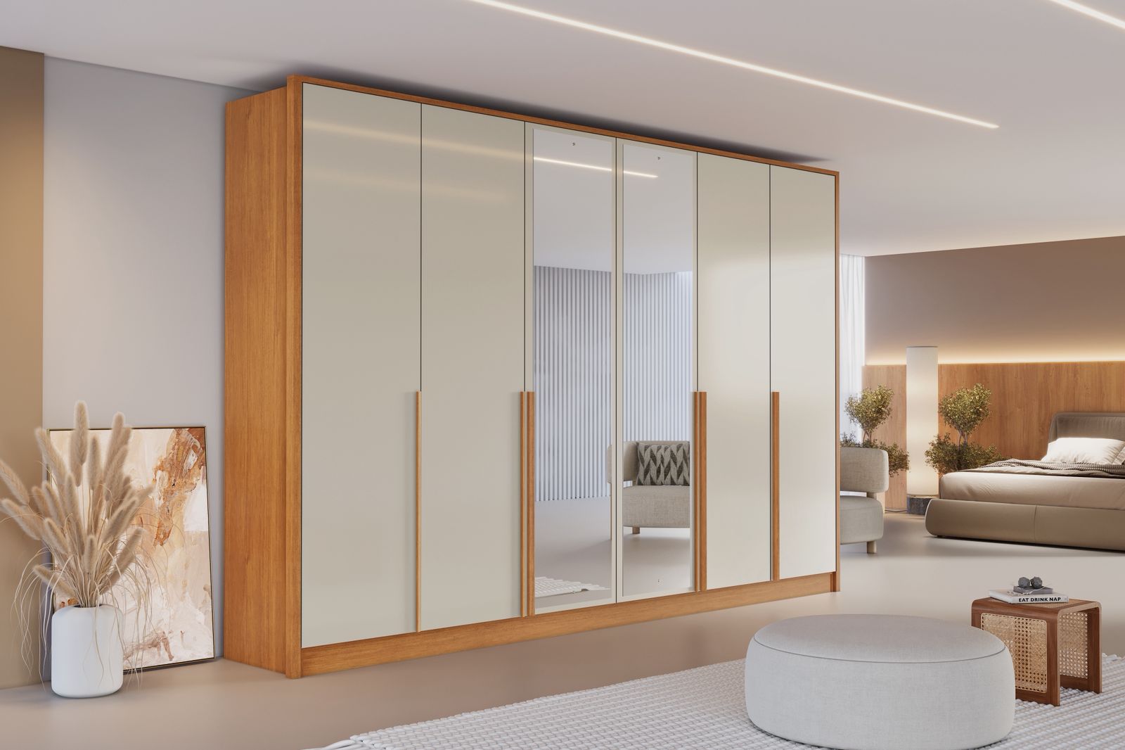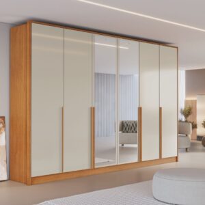 O guarda-roupa Berlim se destaca pelo design moderno e minimalista, com acabamento que transmite leveza e sofisticação ao ambiente. Possui portas amplas com puxadores verticais em madeira, que criam um contraste elegante e contemporâneo. Os espelhos centrais ampliam o espaço e trazem mais luminosidade ao quarto, além de agregar praticidade ao dia a dia. Ideal para compor ambientes clean, organizados e cheios de estilo.