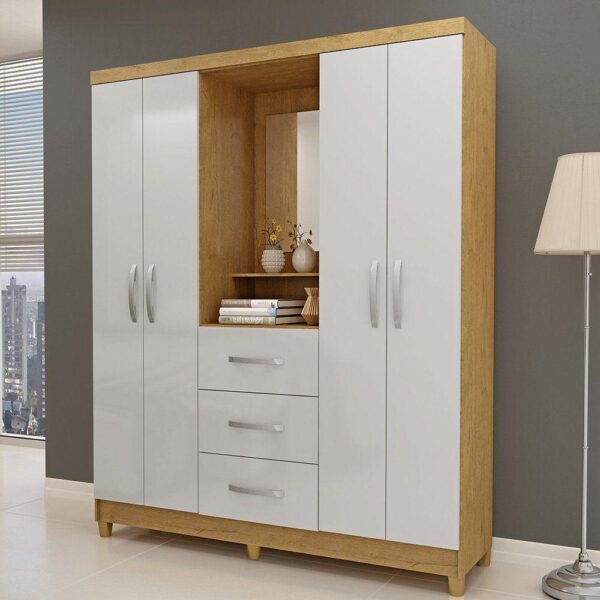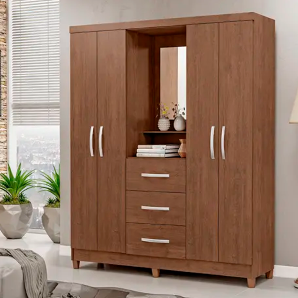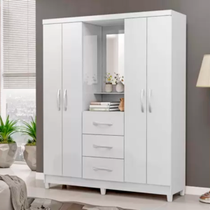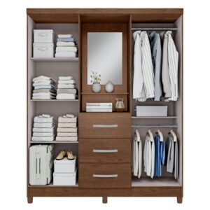O guarda-roupa casal ilhéus da mx móveis, agrega requinte e qualidade em um único produto. Seu espaço interno tem um ótimo aproveitamento do espaço e atende perfeitamente um casal: são 4 portas, 3 gavetas externas, várias prateleiras bem divididas e nichos para roupas, sapatos, acessórios, bolsas, edredons e travesseiros. Os tubos cabideiros são muito resistentes e a profundidade é ideal para qualquer tipo de cabide. Conta ainda com uma penteadeira embutida com espelho tornando seu design singular e moderno.