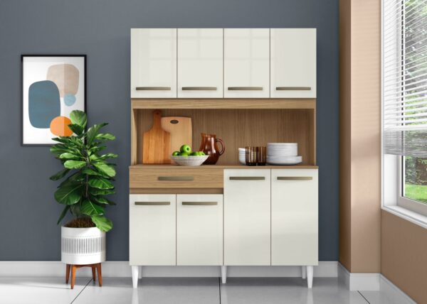 Cozinha Compacta Cléo com 8 portas proporciona amplo espaço interno, resistente e feito com materiais de qualidade, ela deixará tudo no lugar certo, mas sem abrir mão do estilo, do charme e do bom gosto. Deixe seu lar arrumado e moderno.