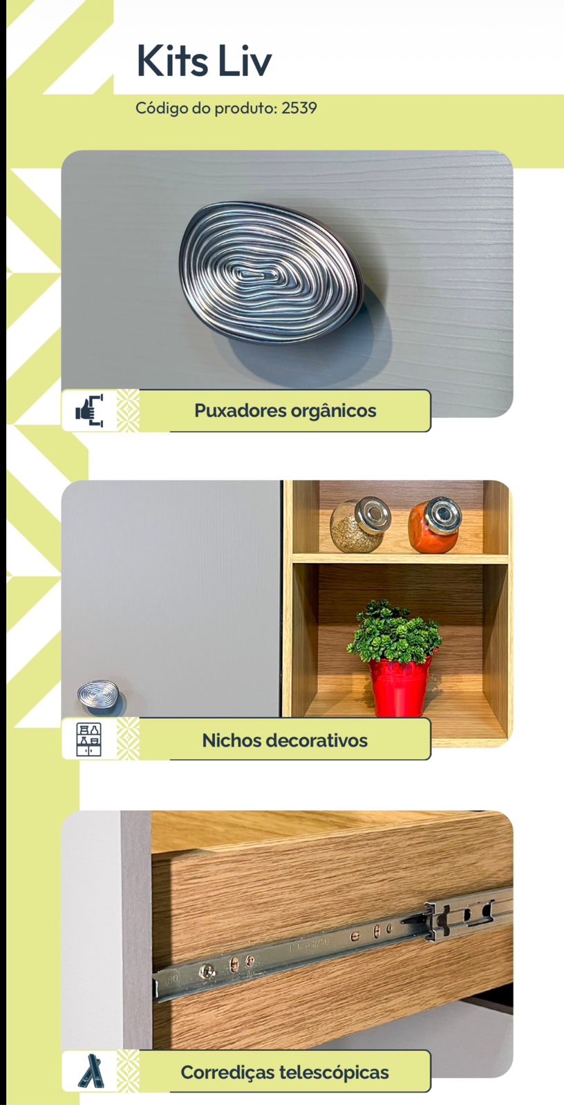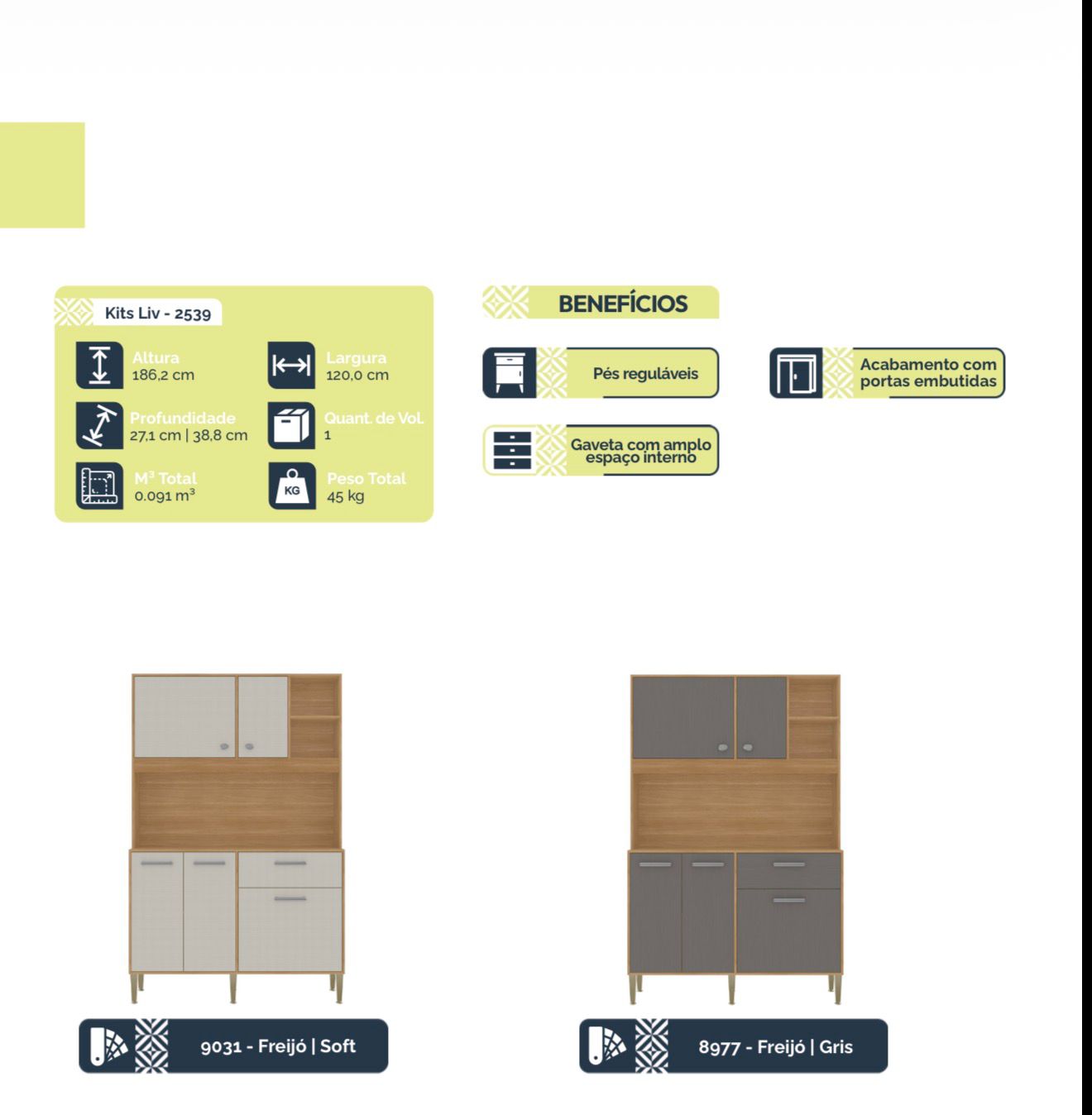 KIT LIV PRODUZIDO EM MDP DE 12MM E 15MM, DOBRADIÇAS COM AMORTECEDOR,PÉS REGULÁVEIS EM PLÁSTICO RESISTENTE, CORREDIÇAS TELESCÓPICAS 100% METÁLICAS.PUXADORES ERGONÔMICOS EM PLÁSTICO RESISTENTE PORTAS E GAVETA COM ACABAMENTO EMBUTIDO.