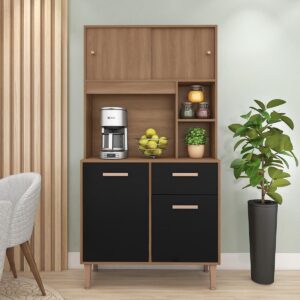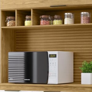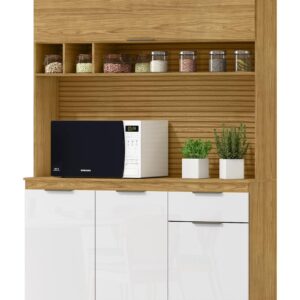o Kit Liz é cheio de vantagens. Excelente para aquele cômodo mais compacto, esse móvel conta com balcão que pode apoiar enfeites, eletrodomésticos ou te auxiliar na hora de preparar aquela refeição especial, enquanto os compartimentos internos recebem louças e alimentos secos, ajudando a deixar tudo bem organizado e no lugar certo para a rotina.