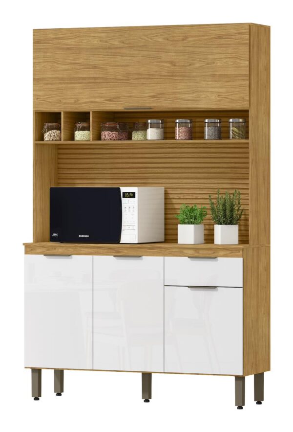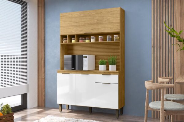 o Kit Liz é cheio de vantagens. Excelente para aquele cômodo mais compacto, esse móvel conta com balcão que pode apoiar enfeites, eletrodomésticos ou te auxiliar na hora de preparar aquela refeição especial, enquanto os compartimentos internos recebem louças e alimentos secos, ajudando a deixar tudo bem organizado e no lugar certo para a rotina.