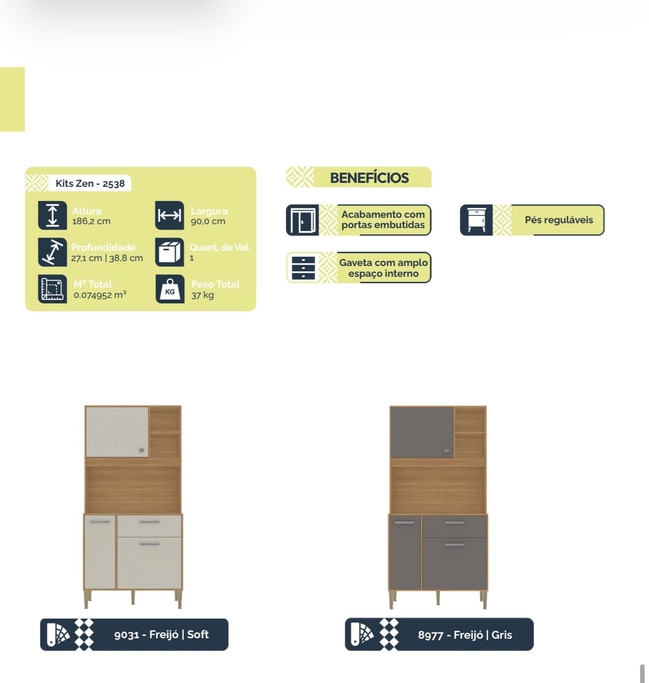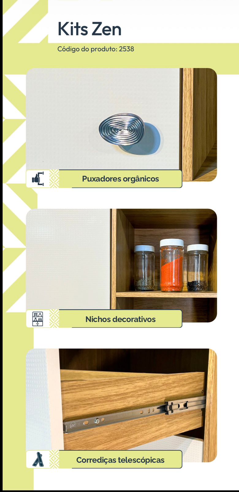 KIT ZEN É PRODUZIDO EM MDP DE 12 MM E 15 MM, COM DOBRADIÇAS COM AMORTECEDOR, CORREDIÇAS TELESCÓPICAS 100% METÁLICAS.PUXADORES ERGONÔMICOS EM PLÁSTICOS RESISTENTE,PÉS REGULÁVEIS EM PLÁSTICO RESISTENTE.